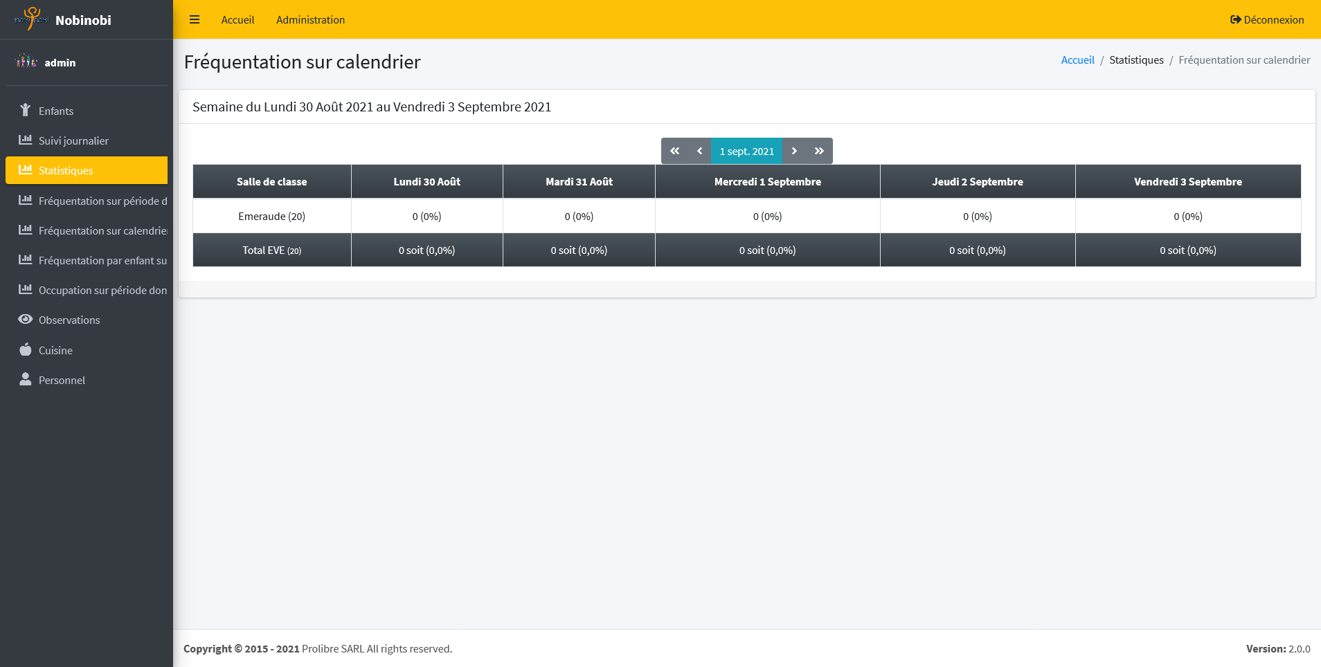 Taux de fréquentation quotidien, total et groupe par groupe, directement depuis le calendrier.